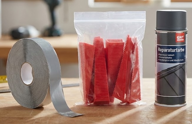 Dach-Montageset “Dicht & Gerade”: Butylband + Nivellierkeile + Reparaturfarbe